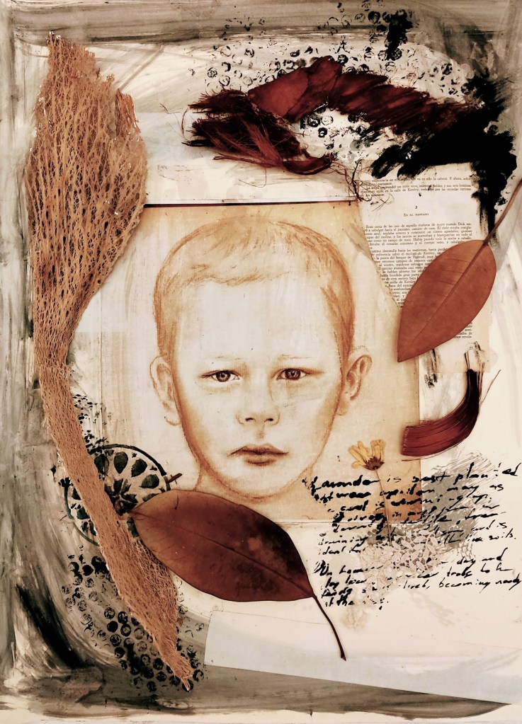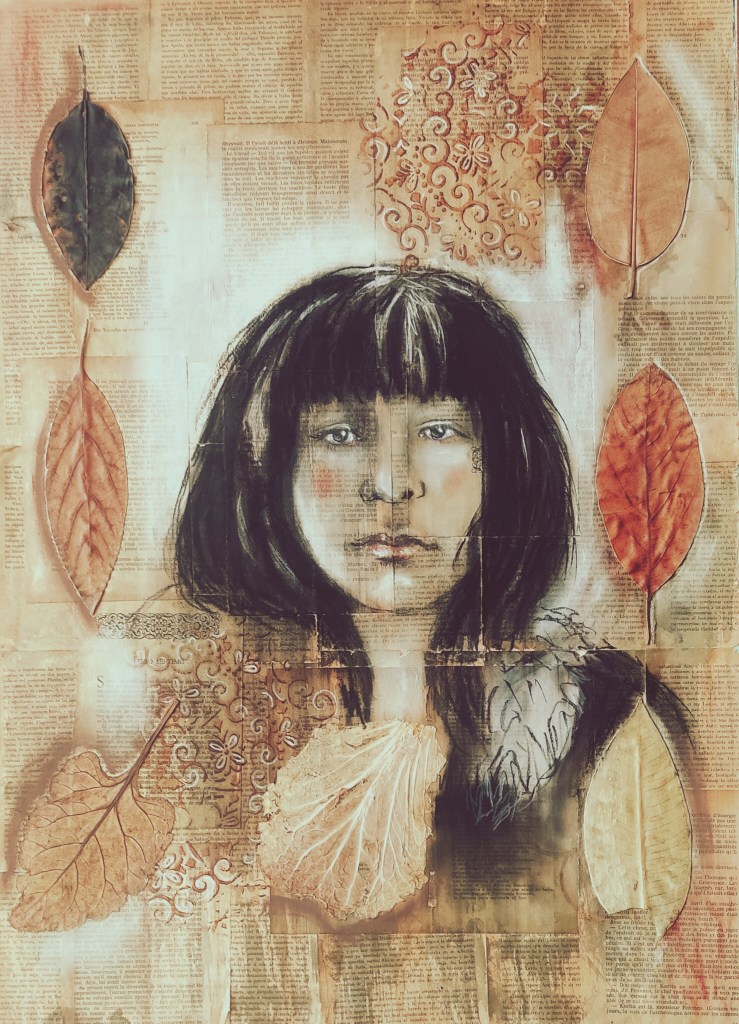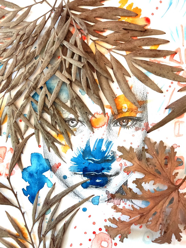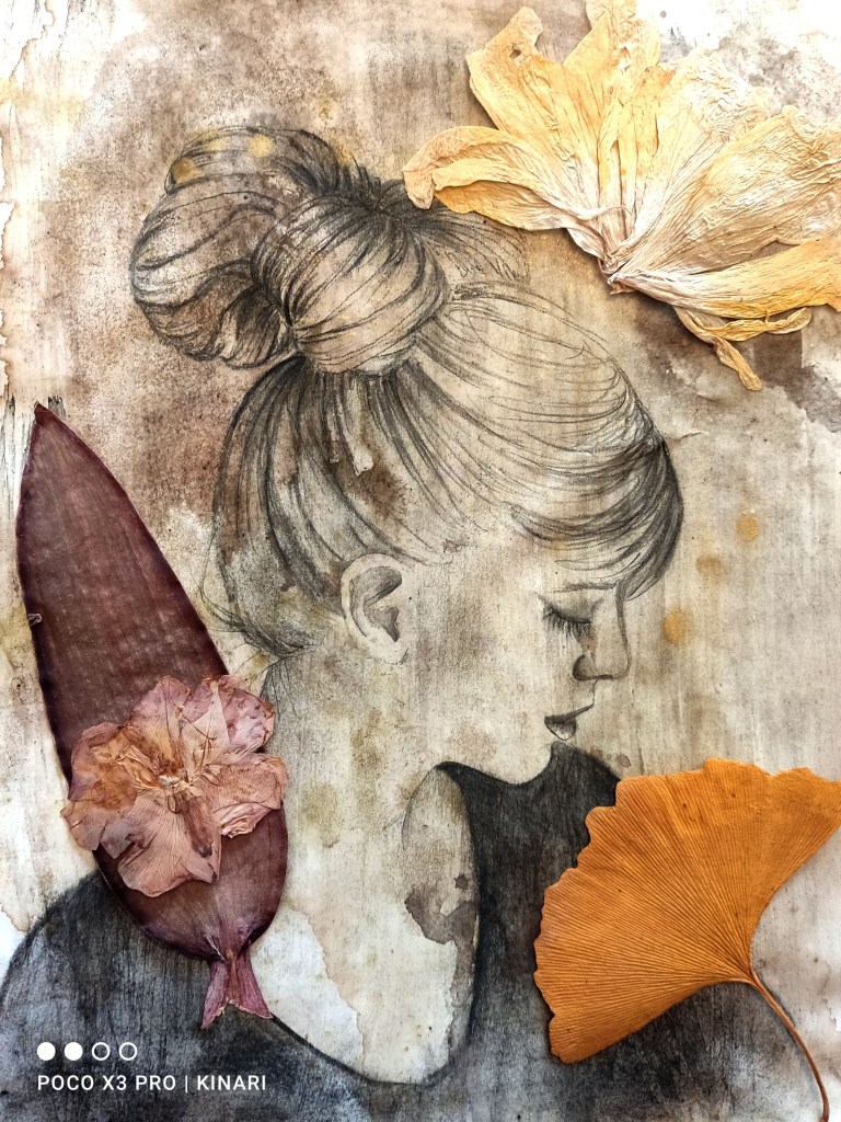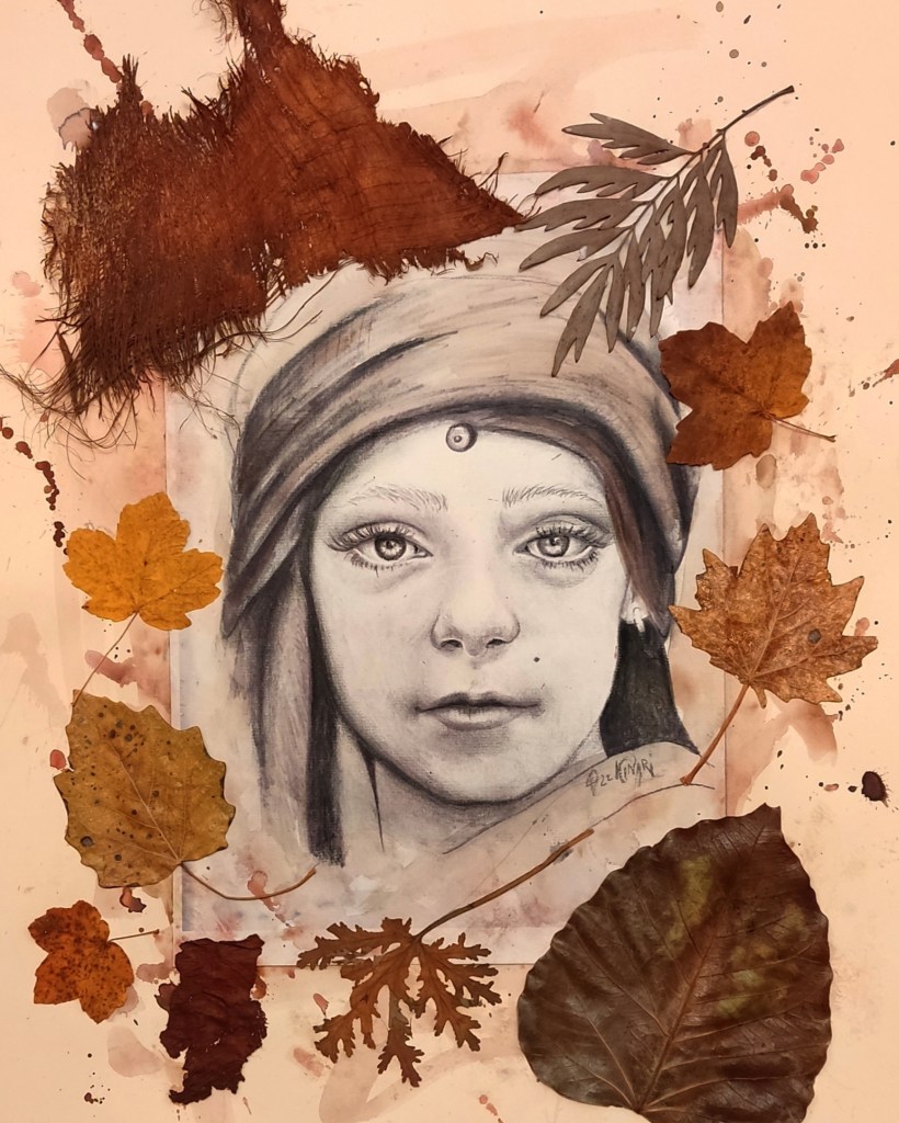 In my portraiture, I explore the profound connection between the human spirit and the natural world, a symbiotic relationship often forgotten in the rush of modern life. Using a diverse array of mixed media techniques—charcoal, graphite, watercolors, and collages of dry leaves and aged book pages—I seek to uncover the hidden narratives etched in the faces of my subjects, while simultaneously reuniting them with the elements from which they emerged. The human face, in all its vulnerability and resilience, is a landscape of experience, memory, and emotion. Every line, shadow, and subtle expression is a reflection of personal and ancestral stories, much like the rings of a tree or the veins of a leaf. My use of charcoal and graphite serves as a tactile medium for capturing these intimate traces—both fragile and enduring—mirroring the ephemeral yet lasting impressions of time on nature. Watercolors bleed into these markings like emotions seeping into memory, fluid and uncontrollable, invoking a sense of life’s impermanence. The incorporation of dry leaves and collages from old book pages further ties my work to the concept of decay and renewal, the cyclical nature of existence. Leaves, once vibrant and full of life, now fragile and dry, become metaphors for the transient nature of our own lives, where beauty resides not only in vitality but in the passage of time. Similarly, the aged book pages represent the accumulation of knowledge, stories, and histories that we carry within us, intertwining personal identity with the broader, timeless human experience. At the heart of my work is the idea that we, as humans, are not separate from the natural world but rather an extension of it. Our faces, like the textures of leaves or the layers of earth, are shaped by time, by experiences, by the environment. We are nature—woven into the fabric of the world around us, deeply rooted in the elements, inseparable from the cycles of growth, decay, and rebirth. In my art, I strive to make this connection visible, not only as a reminder of our place within the ecosystem but as an invitation to reimagine ourselves as part of an eternal narrative shared with the earth, plants, and all living things.